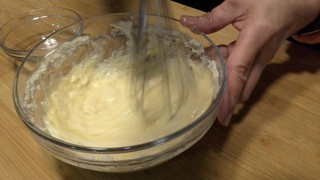 Ponemos en un bol la nata (crema de leche) para cocinar, los huevos, el queso parmesano, nuez moscada, sal y pimienta. Batimos con un batidor manual para mezclarlo bien.