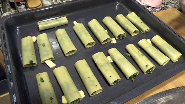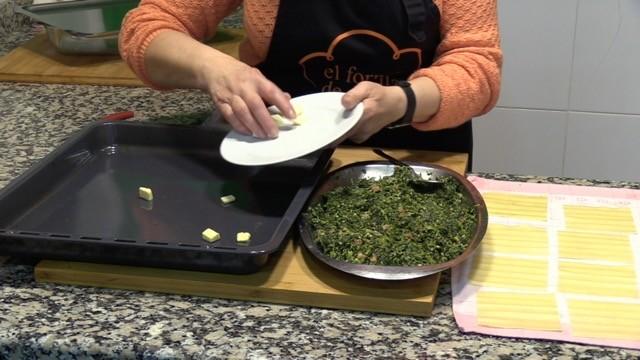 Ponemos las espinacas dándole la forma como de croqueta encima de cada placa. Las envolvemos y las ponemos en una fuente resistente al horno untada con unos trocitos de mantequilla.