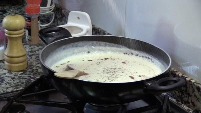 Añadiremos la nuez moscada, la sal y la pimienta y seguimos removiendo todo el tiempo ya que se podría pegar la salsa al fondo de la sartén.