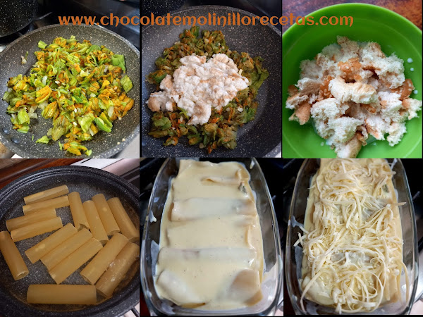 Aparte, hervimos agua y colocamos los canelones, la primera vez que hice la receta utilicé láminas para canelón, se me hace mejor, pues puedes manipular mejor la pasta, esta vez usé los canelones ya formados, en tubito, pero se rompían un poco, y no quedan tan bonitos, les recomiendo mejor usar láminas.... además es mejor usar pasta que cocinemos en un poco de agua, pues requiere horneado pero sólo para gratinar, así que usar pasta precocida rígida no es buena idea, yo uso esos canelones cuando los haré rellenos de carne y bañados en salsa de tomate y que llevan un poco más de horneado, que hará que la pasta se cocine y suavice... por ese motivo no es buena idea usarlos en este caso...