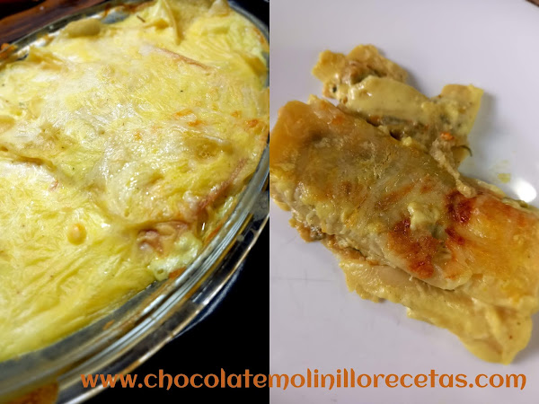En esta ocasión, aunque en realidad no lo lleva en la receta que quise recrear, puse curry, le dio un ligero sabor y un lindo tono amarillo a la bechamel.