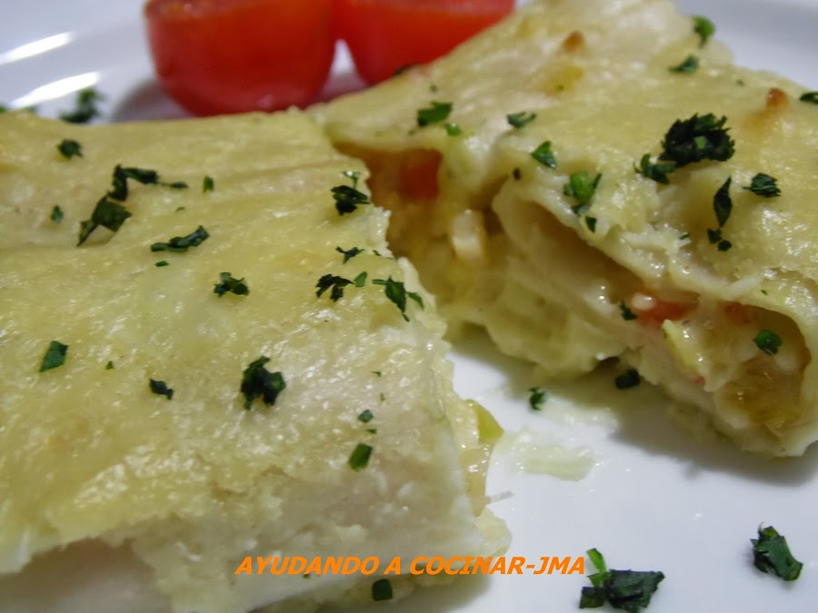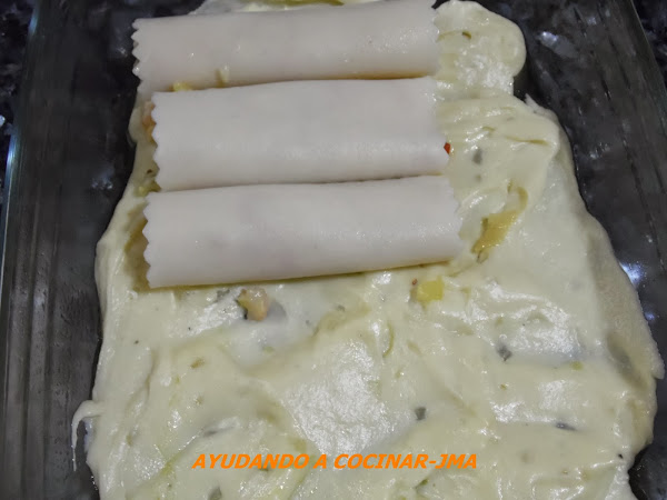 cerrarlos en forma de tubo e ir colocándolos sobre la bechamel que se ha puesto en el fondo del recipiente.