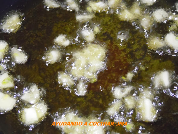 dejar freír a fuego medio hasta dorar, añadir la pizca de guindilla molida y reservar