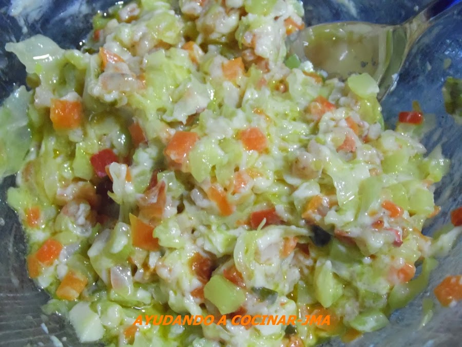A parte en un recipiente añadir un par de cucharadas de bechamel y las gambas fritas a la verdura ya rehogada.