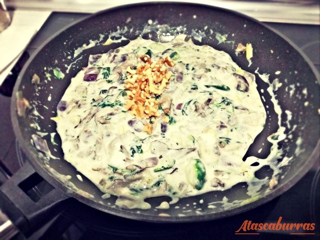 Una vez esté integrado el queso con la bechamel añadimos nueces picadas, removemos y apartamos del fuego