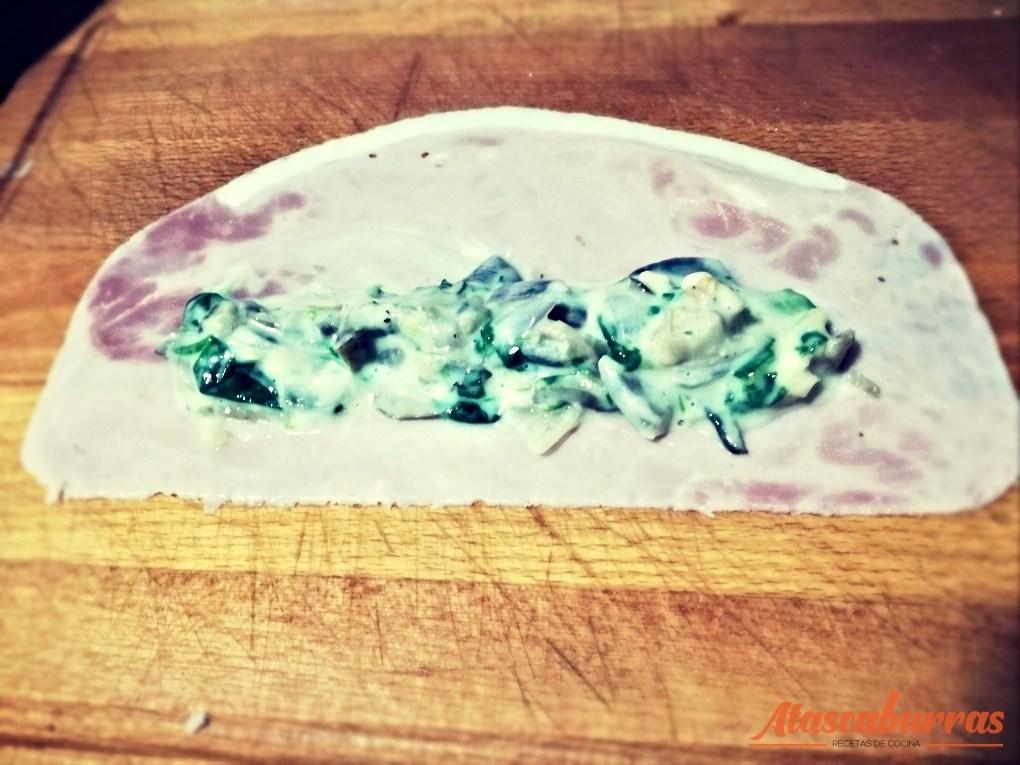 Eechamos la mezcla de bechamel, en horizontal sin echar demasiado y dejando tanto la base como los bordes un cm de distancia para facilitar el enrollado