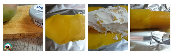 2.- Mezclamos el queso de untar con los trozos de mango picados. Lo guardamos en la nevera 20 minutos. Sobre un trozo de papel de aluminio colocamos 6 lonchas de mango, para formar una capa. Ponemos en el centro del mango 2 cucharas de queso con mango. Con la ayuda del papel de aluminio cerramos el canuto o canelon de mango lo guardamos en la nevera 1 hora. Repetimos la misma operación hasta formas los 4 canelones. Los retiramos de la nevera después de 1 hora, los ponemos sobre una tabla de cortar y le quitamos los bordes. Servimos los canelones con un poco de caramelo por encima.