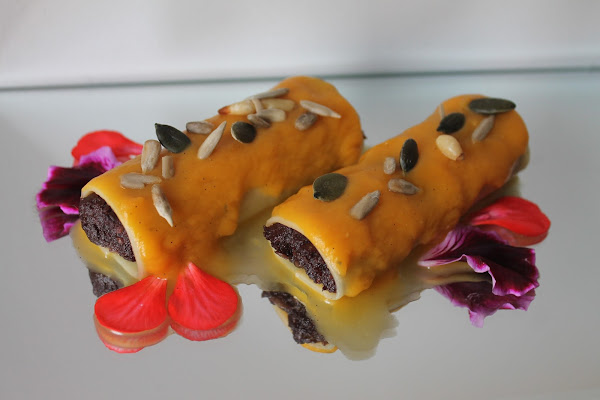 Colocamos los canelones en un plato y cubrimos con la salsa de calabaza a la vainilla. Decoramos con unos frutos secos y unos pétalos de flores, o alguna hierba aromática.