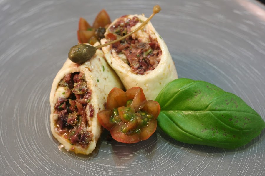 Cortamos la mozzarella en dos y ponemos las mitades bien separadas en un plato con papel vegetal. Metemos al microondas durante un minuto. Veremos que la mozzarella se ha derretido y que ha soltado algo de líquido. Secamos el exceso de suero con papel absorbente y estiramos la mozzarella con la palma de la mano. Cuando se haya enfriado ligeramente, rellenamos y enrollamos. Dejamos enfriar del todo y cortamos los laterales de tal modo que queden simétricos. Cortamos por el centro y servimos acompañando nuestros canelones de un alcaparrón y un tomate cherry.