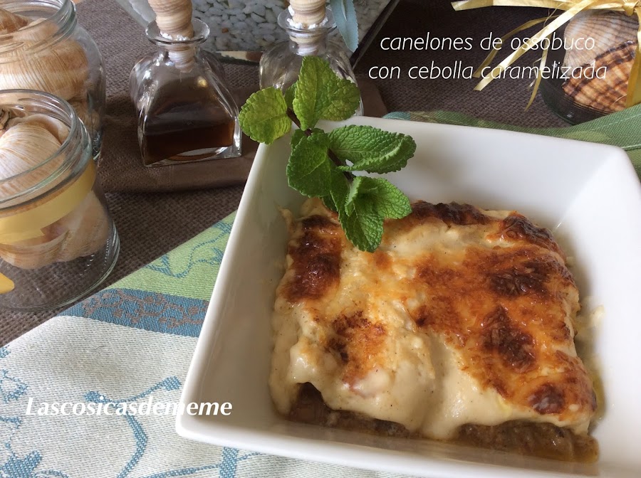 Partimos la carne que vamos a utilizar, en esta receta será el ossobuco cocinado, mezclamos con el foie, la cebolla caramelizada y unas cucharadas de la bechamel, que nos quede meloso para facilitar el relleno de los canelones.