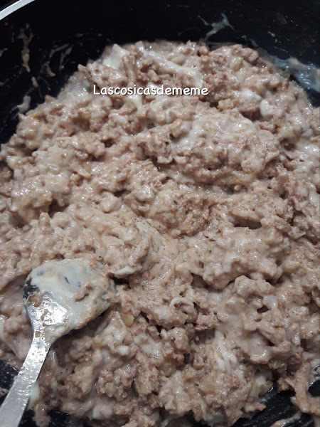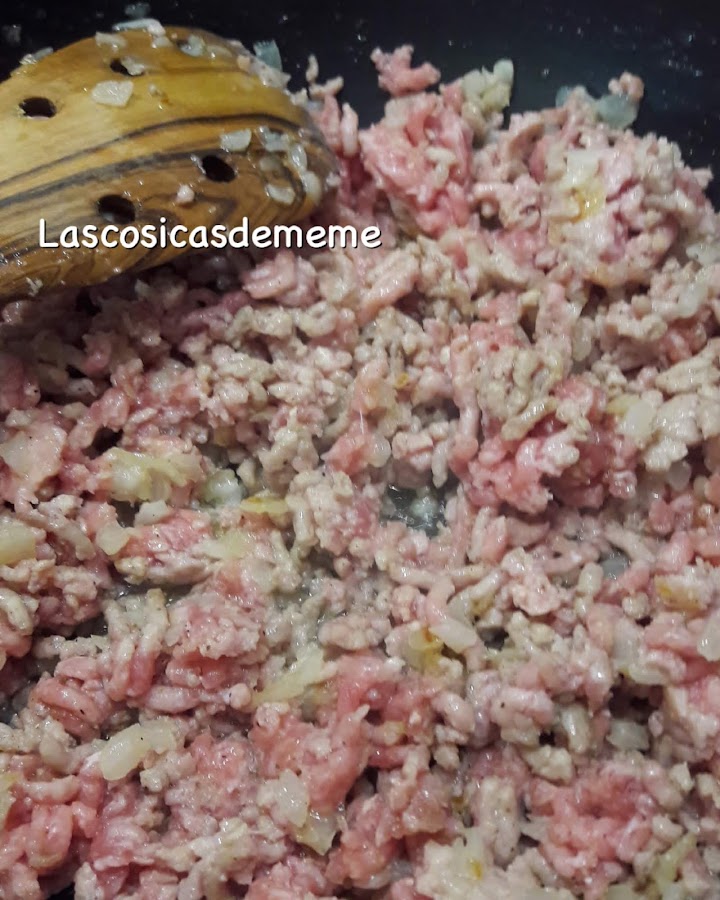 Después añadimos la carne, como vemos en las fotos, lo rehogamos hasta que la carne cambie de color. Retiramos del fuego dejamos que se temple un poco. Entonces añadimos el paté, mezclamos bien y reservamos.