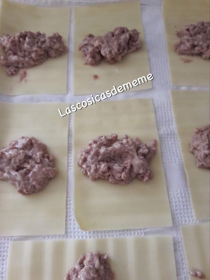 Le ponemos como una cucharada del relleno a cada lámina, como se ve en la foto. Los cerramos de forma envolvente...