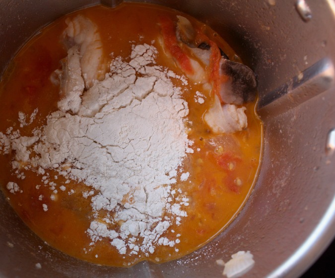 Sin lavar el vaso (acabas de prepara la masa) ponemos el caldo de pescado, la leche, la harina, la mantequilla, la nuez moscada y la pimienta. Programamos: