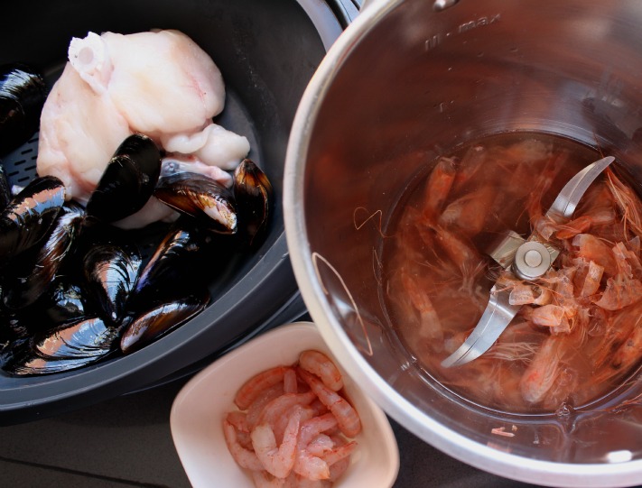 Añadimos los cuerpos de las gambas, el rape, los cuerpos de los mejillones, el vino blanco, sal y pimienta. Programamos:
