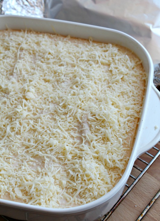 Pasado el tiempo de horneado, quitamos el papel de aluminio y espolvoreamos queso rallado. Gratinamos hasta que la superficie esté dorada.