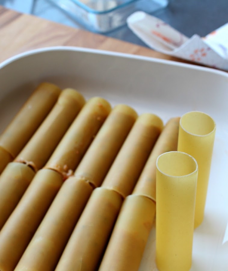 Una manga pastelera con la masa dentro. Si has utilizado canelones de pasta seca (como yo), vas rellenando y colocando en una bandeja para hornear.