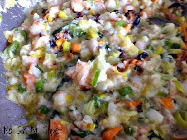 2. En una sartén rehogar las verduras bien picaditas con un poco de aceite. Cuando estén pochaditas, añadir la merluza, las gambas y los mejillones también picaditos. Dejar que rehoguen un par de minutos, añadir el caldo de los mejillones o un chorrito de vino, y dejar que reduzca, para que termine de hacerse el pescado.