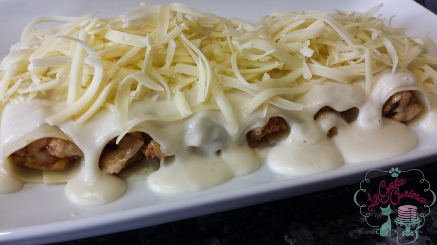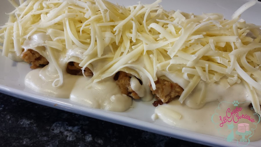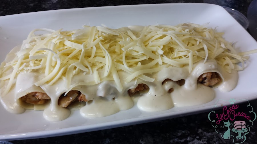 Cocemos o remojamos los canelos según los que usemos el tiempo que marque el fabricante, ponemos en una fuente una pequeña cantidad en la base de bechamel y sobre ella los canelones. Cubrimos con bechamel y queso rallado.