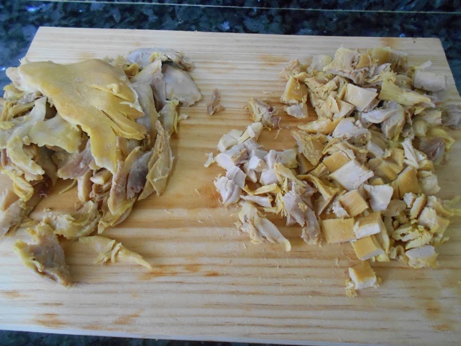 Picamos en trocitos muy pequeños la pechuga ya cocida. Yo suelo usar restos de pollo o del cocido o de pollo asado que me haya quedado