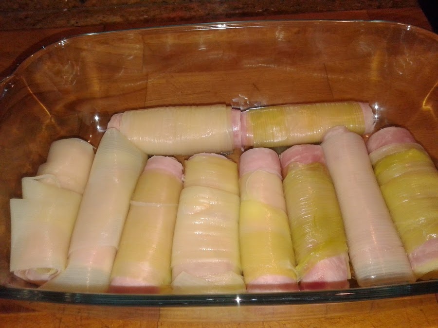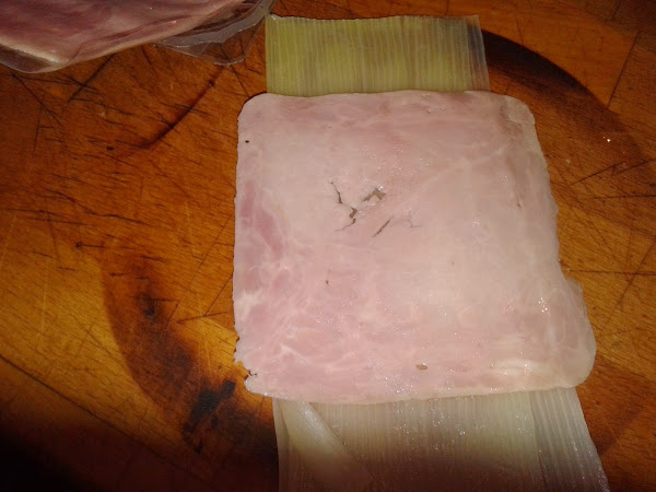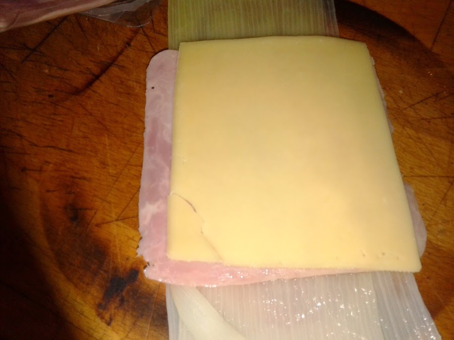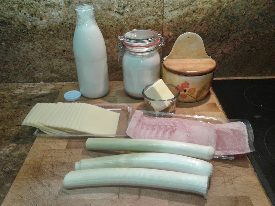 4 puerros grandes, 12 lonchas de queso, 12 lonchas de jamón york, 100 gr de mantequilla, 3 cucharadas soperas colmadas de harina, 750 ml de leche, pimienta y sal.