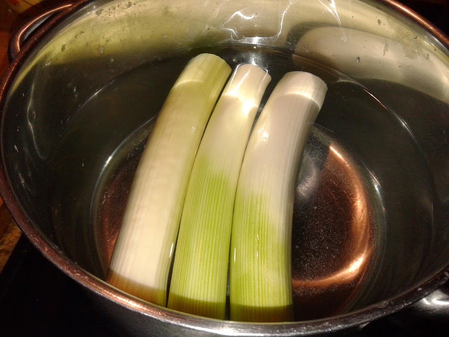Cortamos la parte verde fea y la cabeza de los puerros y los ponemos a hervir.