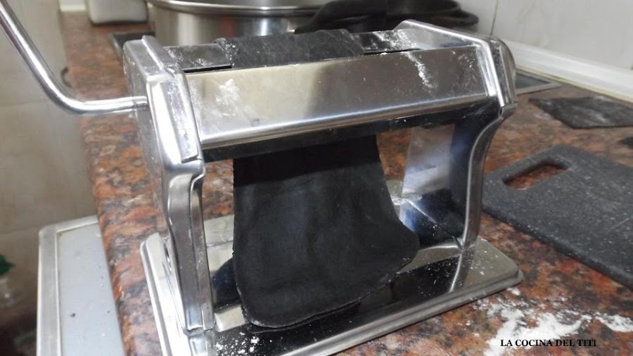 1º Haremos la masa para la pasta en el que simplemente mezclamos huevo, tinta y harina hasta conseguir una masa homogénea e integrada. Dejamos en el frigorifico durante 1 hora.