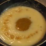 En una sartén ponemos la mantequilla doramos en ella un poco la harina de maíz y añadimos el caldo caliente procurando que no nos queden grumos. Sazonamos con nuez moscada, pimienta y sal y añadimos esa parte líquida (o gelatinosa) de nuestro guiso que habíamos reservado. Lo movemos bien y cuando nuestra velouté tenga la consistencia deseada (debe quedar bastante fluida) la separamos del fuego.