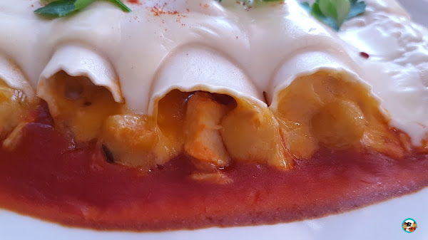 4.- En una fuente de horno vertemos el tomate frito, disponemos los canelones encima. Cubrimos los canelones con la salsa bechamel, llevamos al horno a 180º cocinamos 5 minutos. Servimos con un poco de pimentón por encima y unas hojas de perejil fresco.