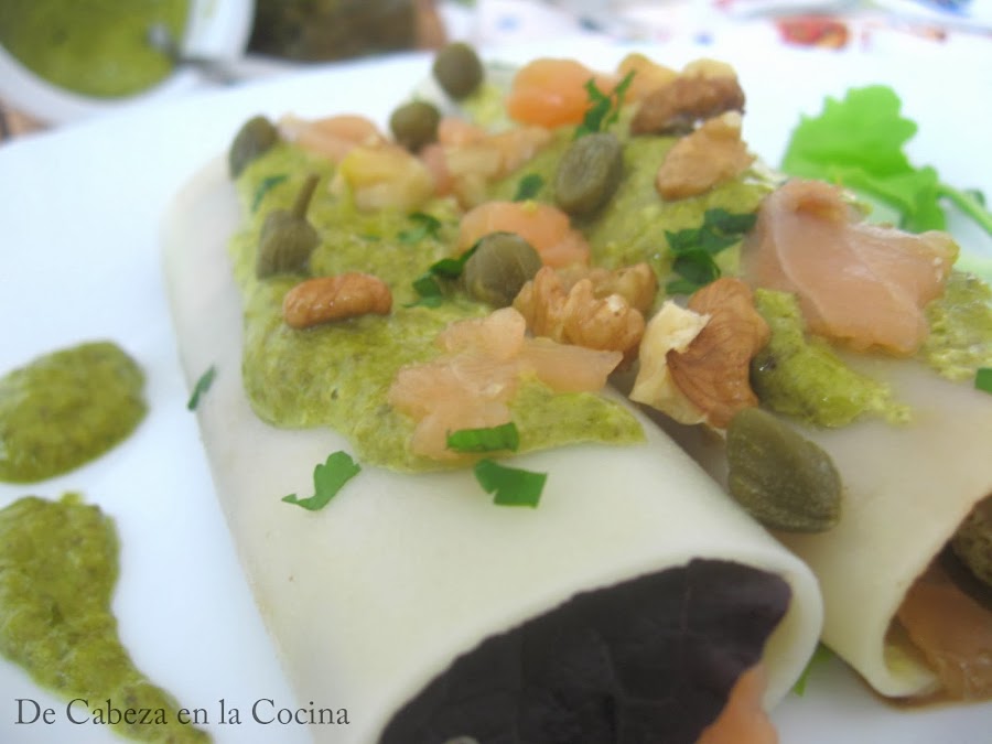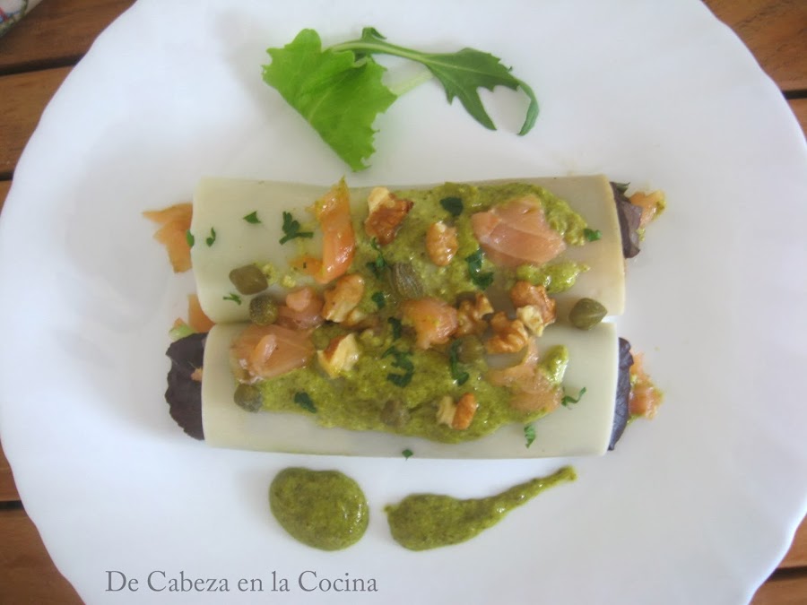 Sobre este regar un par de cucharadas de pesto, regar alcaparras y nueces o piñones y una cucharadita de salmón picado en tiritas.