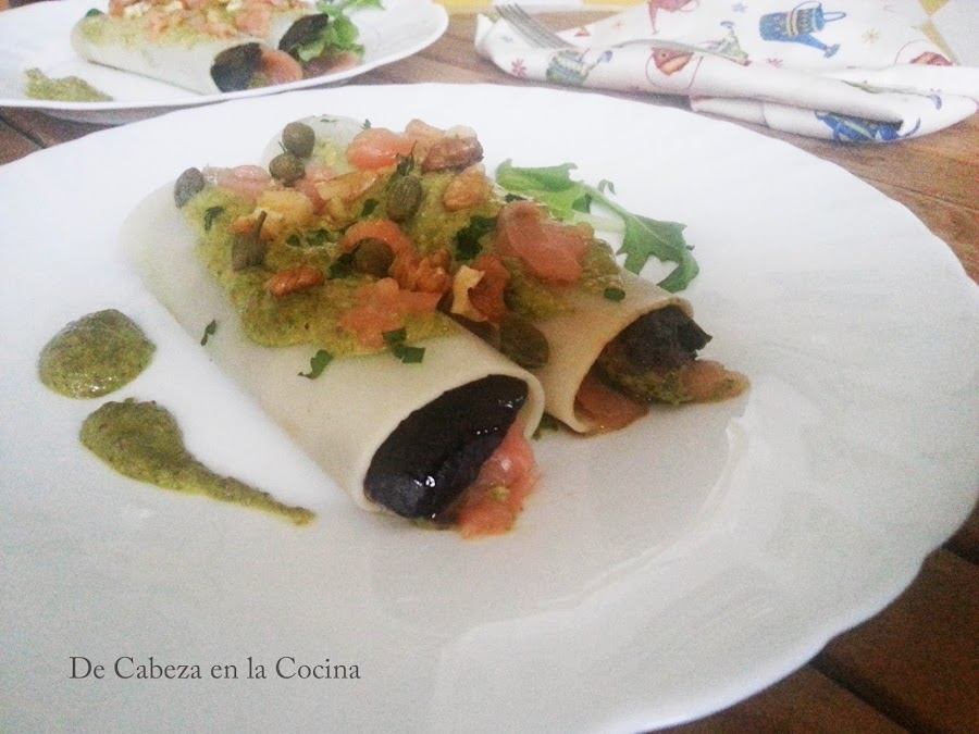 A que a veces hay recetas que no pueden esperar. Eso me ha pasado con estos canelones que tan pronto los vi en el blog de Mara, me encantaron y tuve que salir corriendo a prepararla por práctica y novedosa. Me parece que es una receta "gourmet". Os la recomiendo, de verdad que es exquisita.