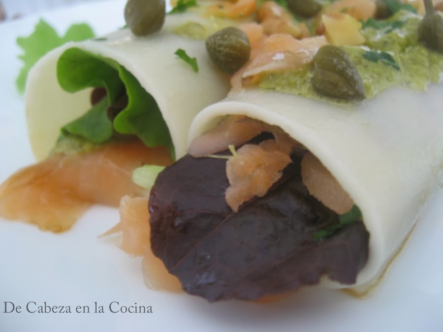 Extender la lamina de canelon, poner encima hojas de lechuga, regar con la salsa de aceite soja, encima colocar el salmón, untar una cucharadita de pesto y enrollar el canelon.