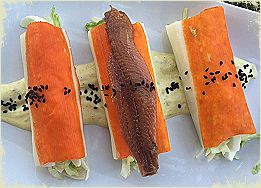 Dentro del canelón, podemos poner otras verduras crudas que nos gusten, como, col cortada a tiras, ( las hojas más blancas, ligeramente escaldadas y puesta en agua y hielo, pues le quitará parte de sabor fuerte y conservará la textura crujiente),alcaparras, aguacate, espárragos verdes o blancos, hervidos, etc.