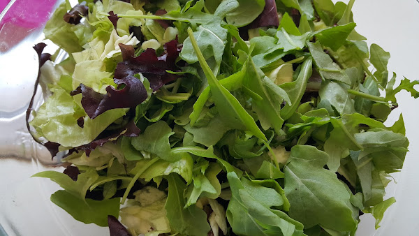 En un bol mezclamos lechugas de varios tipos, las que más os gusten; yo elegí una bolsa que lleva lechuga trocadero, hoja de roble morada y verde, iceberg y le añadí rúcula.