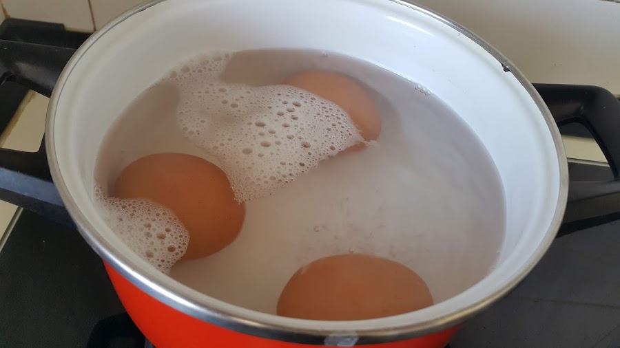 - mayonesaLo primero que haremos será cocer los huevos. Yo los pongo en una olla con un poco de sal y con el agua fría. Desde ese momento hasta que están listos, los dejo 15 minutos vigilando que, una vez rompa a hervir el agua, no esté el fuego muy alto para que los huevos no vayan dando golpes y se puedan llegar a romper. Una vez estén listos los dejamos enfriar.