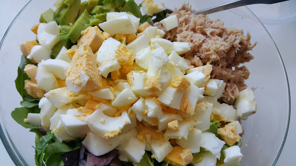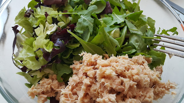 Escurrimos el aceite de una lata de atún, lo troceamos con un tenedor y lo añadimos al bol.
