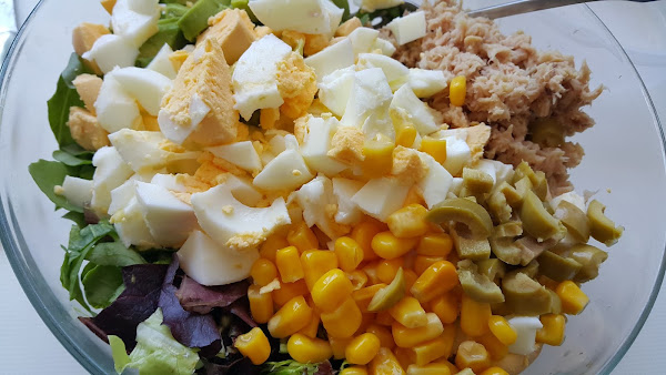 Por último añadimos un par de cucharas de maíz y unas pocas aceitunas. Como se trata de un relleno tipo ensalada podéis variar los elementos y añadir los que más os gusten, pero esta combinación queda muy bien.