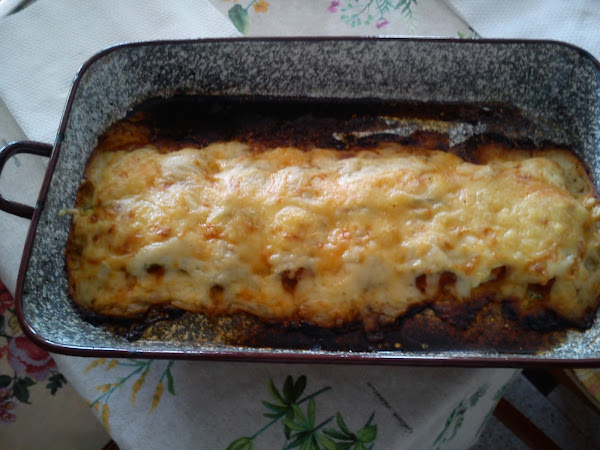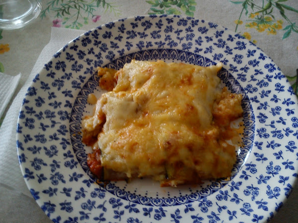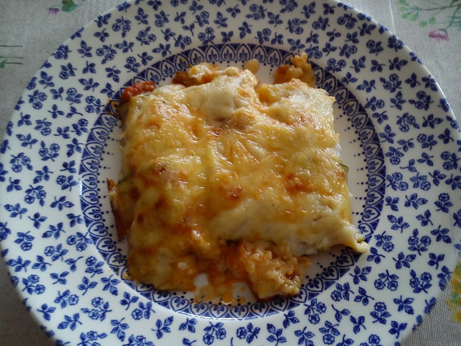 No llevan pasta porque en su lugar he puesto tiras muy finas de calabacín, el relleno podría haberlo hecho casero pero como no quería pasarme toda la mañana en la cocina he puesto un pisto de bote que sale buenísimo (marca Hida) mezclado con 1 lata de atún, bechamel y queso rallado para gratinar, simple pero buenísimo!