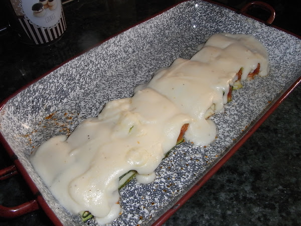 Lo que más trabajo me llevó fue sacar unas tiras anchas y bonitas porque como no tengo una mandolina lo hice con un pelador, entonces tuve que sobreponer hasta 3 para que diese la medida que yo quería para el canelón.