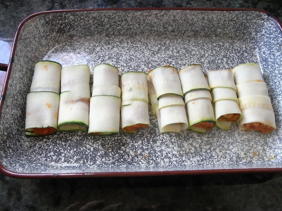 Después hay que superponerlas para que dé más o menos la medida de un canelón, si os salen anchas con 2 es suficiente, si no con 3. Ponemos una cucharada del pisto a un lado, enrollamos el calabacín para que cierre y cortamos el sobrante. Vamos poniéndolos en una bandeja para horno.