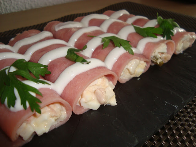 Poner en cada loncha de jamón una cucharada generosa de relleno y liar el canelón.
