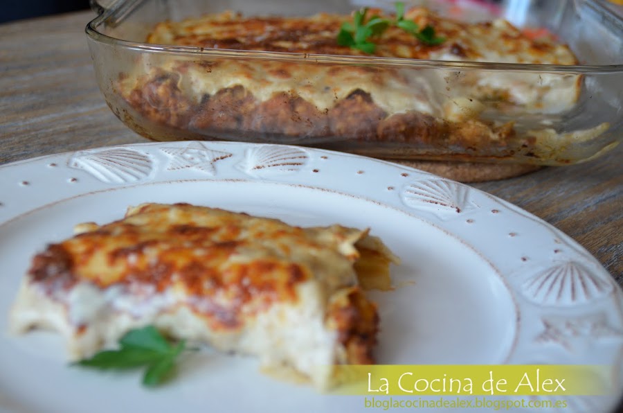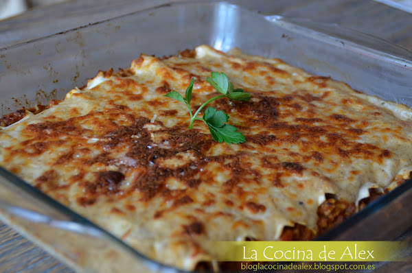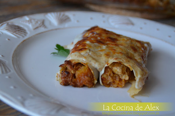 Ahora vamos a montar los canelones, ponemos un poco de la bechamel que acabamos de hacer (3-4 cucharadas) en el relleno y removemos para que se junte todo. Vamos poniendo una cucharada de relleno en cada lamina de pasta, enrollándolos y poniendo cada canelón en una fuente de horno, así hasta que terminemos con las laminas de pasta y todo el relleno.