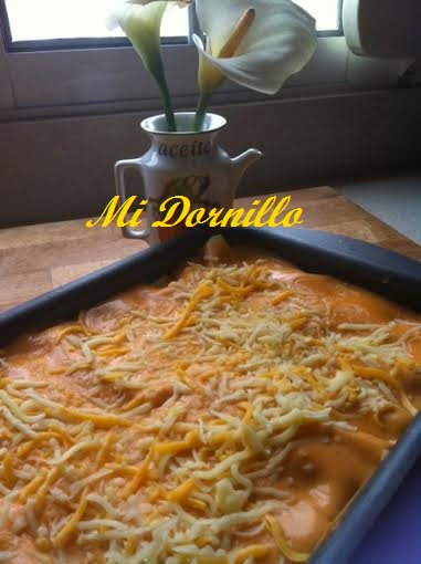 Añadir a la Bechamel el tomate frito para darle color. Poner esta por encima de los canelones. Cubrir con los quesos .Poner en el horno al grill hasta que doren.