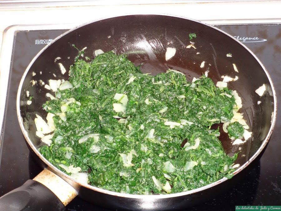 Picaremos la cebolla y la pondremos a pochar en una sarten con aceite a fuego medio-bajo. Cuando comience a dorarse, echaremos las espinacas y removeremos. Salamos y dejamos cocinar unos minutos. Retiramos del fuego y reservamos.
