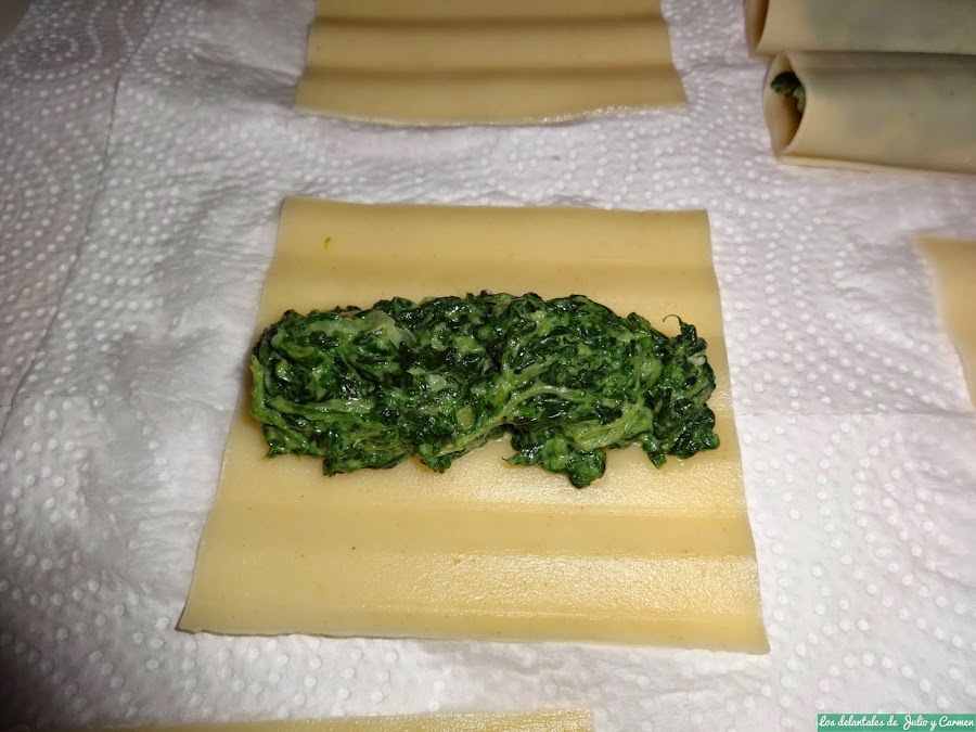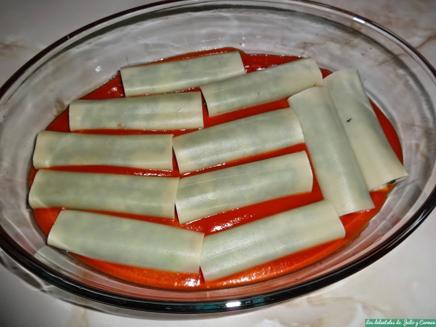 Vamos montando los canelones (habremos escurrido las laminas del agua) e iremos distribuyendolas en una fuente en la que previamente habremos puesto una cama con el tomate frito.
