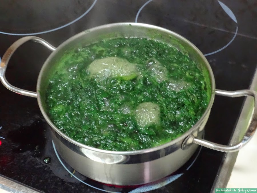 Añadimos a las espinacas y mezclaremos todos los ingredientes. Probaremos para rectificar de sal en caso necesario.