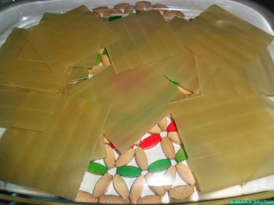 Pondremos las laminas de pasta en agua caliente (o las pondremos a hervir, dependiendo del tipo de pasta) para que se vayan preparando.