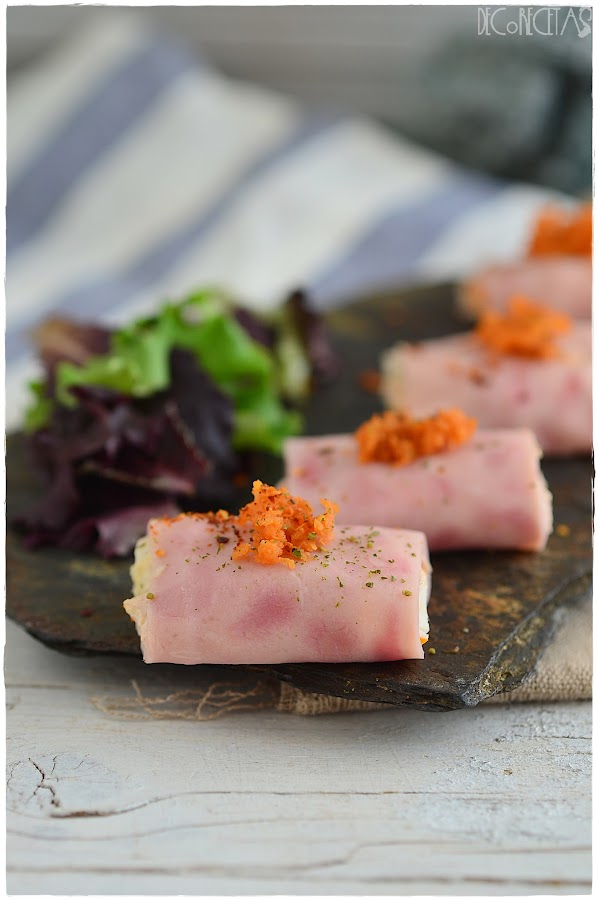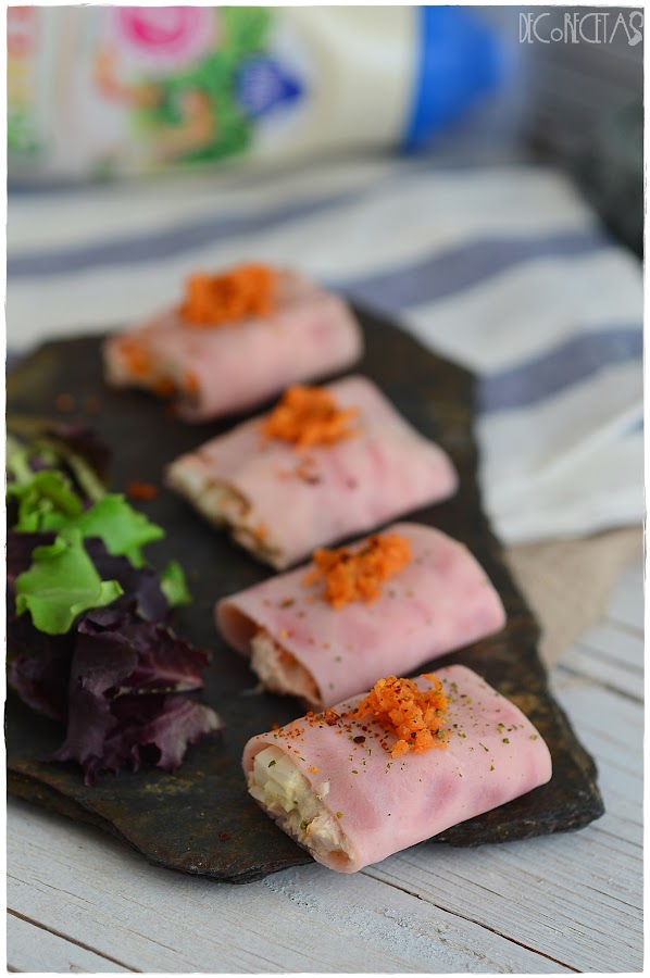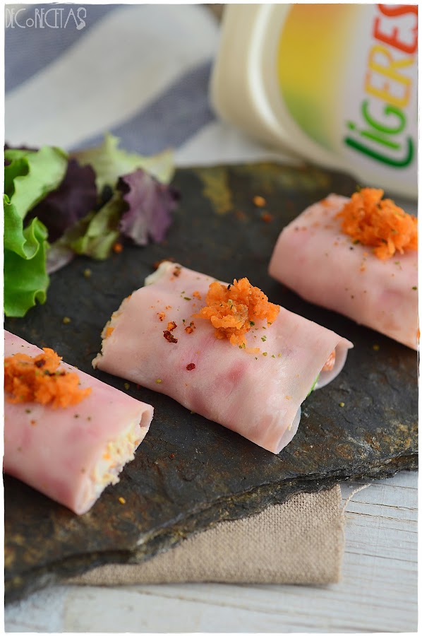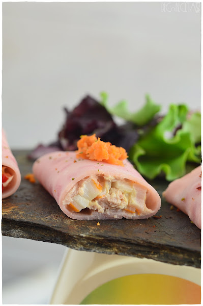 Se trata de enrollar un relleno de lo que elijamos dentro de una locha de jamón york y comer bien fresquito!! Para esta ocasión, rellené de una mezcla de mahonesa, palitos de cangrejo, pimiento rojo picado, cebolleta picada y atun. Por encima, zanahoria rallada y listo!!