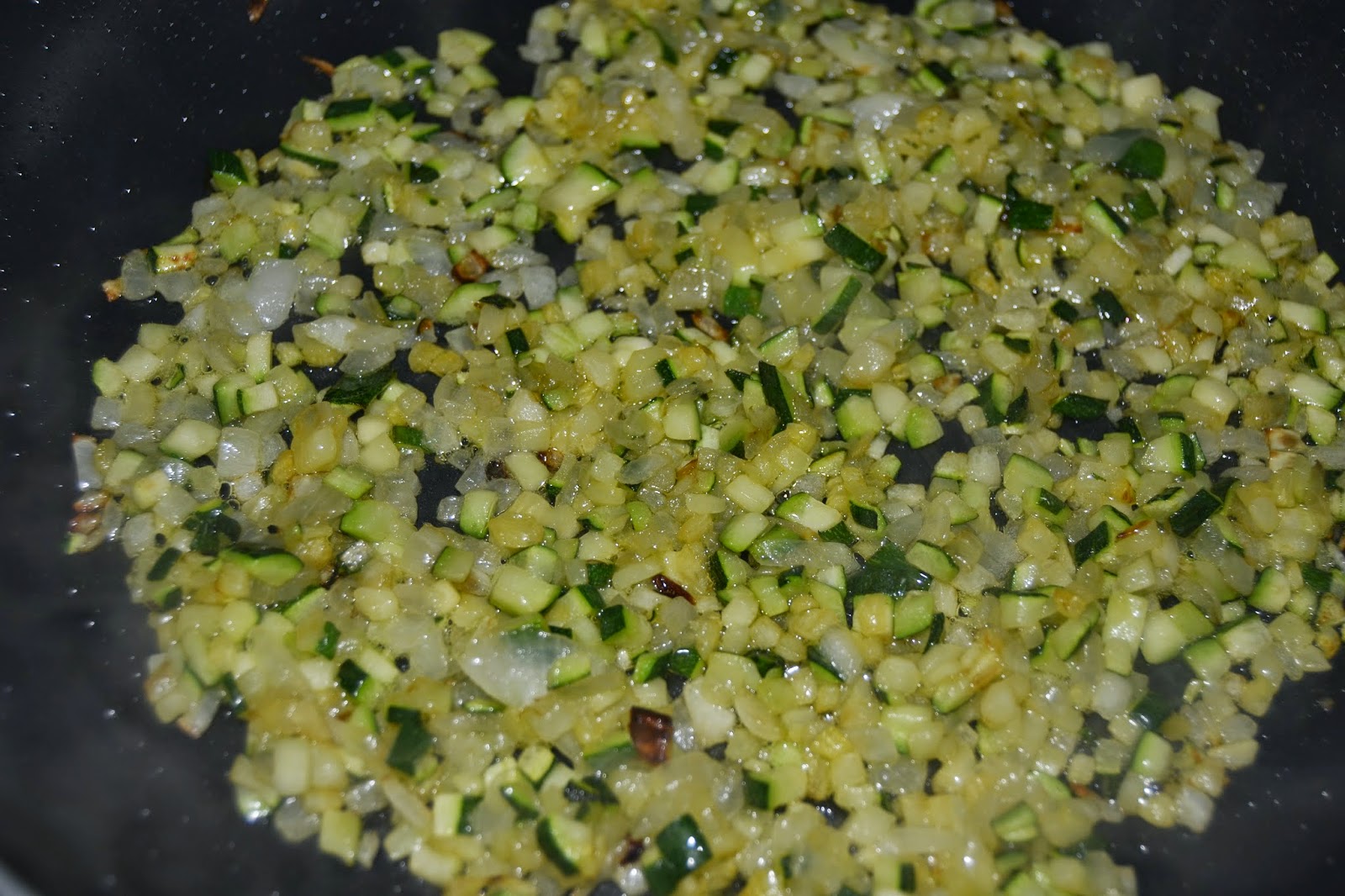 En un perol ponemos un poco de aceite de oliva y pochamos la cebolla que habremos cortado pequeñita, le ponemos sal. A continuación echamos el calabacín también cortado a cuadraditos y rehogamos todo hasta que se pongan tiernos, apartamos.
