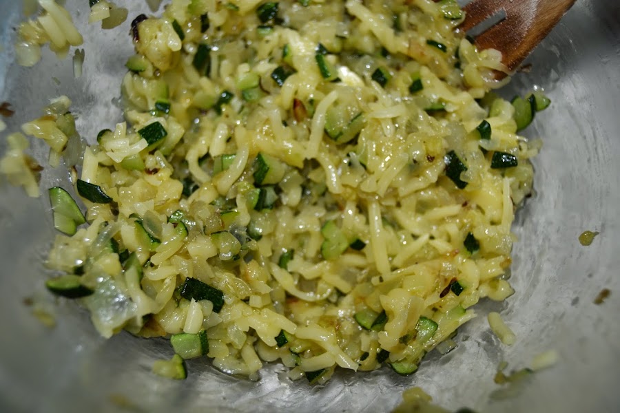 Quitamos el exceso de aceite (si lo tuviera) y añadimos el queso rallado, integramos bien y dejamos que se enfríe un poco.