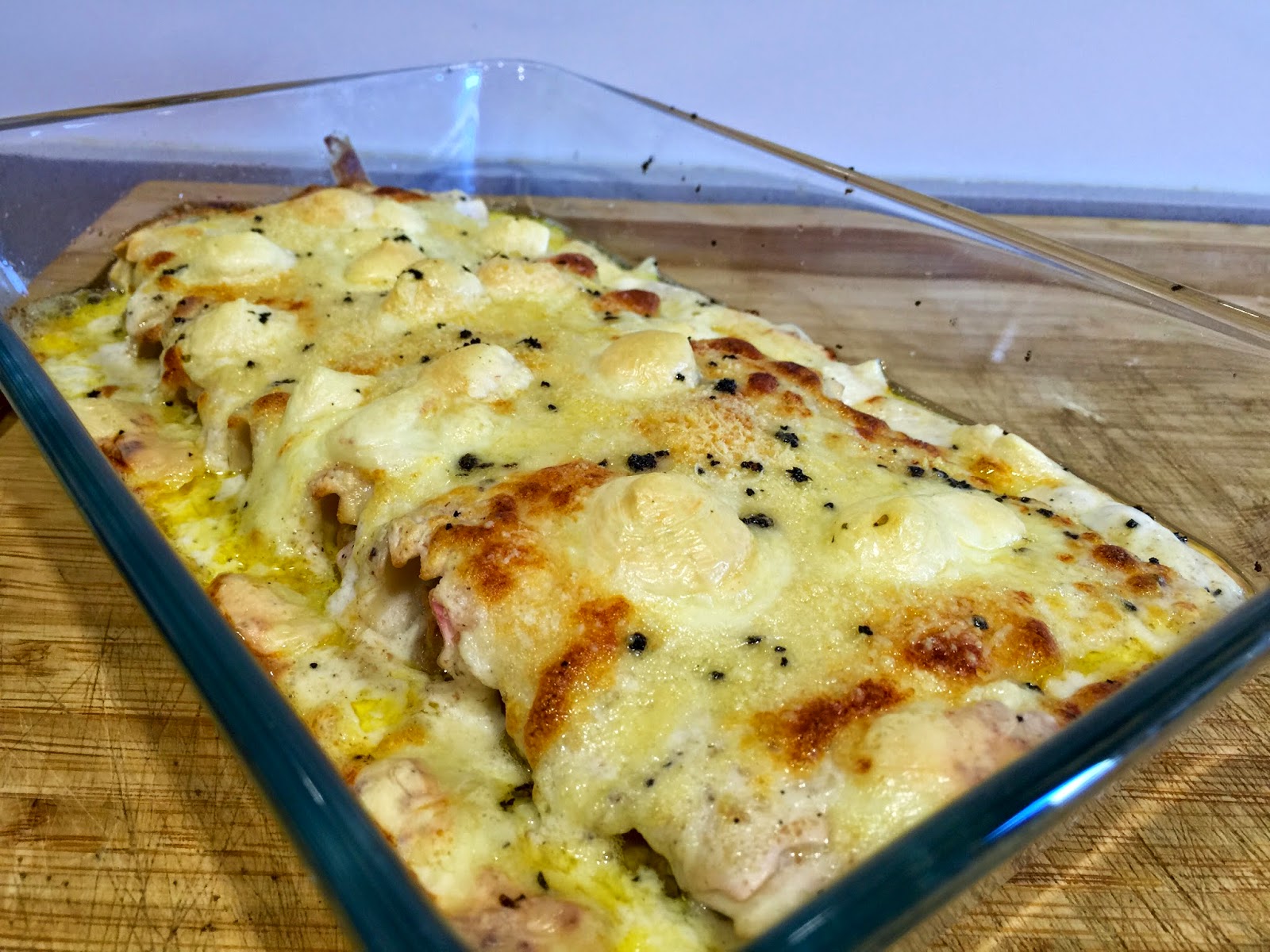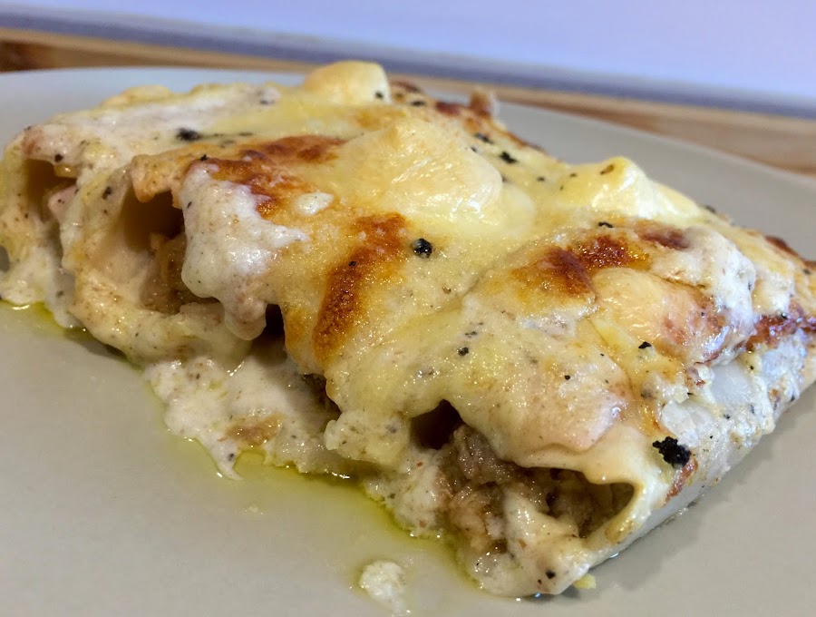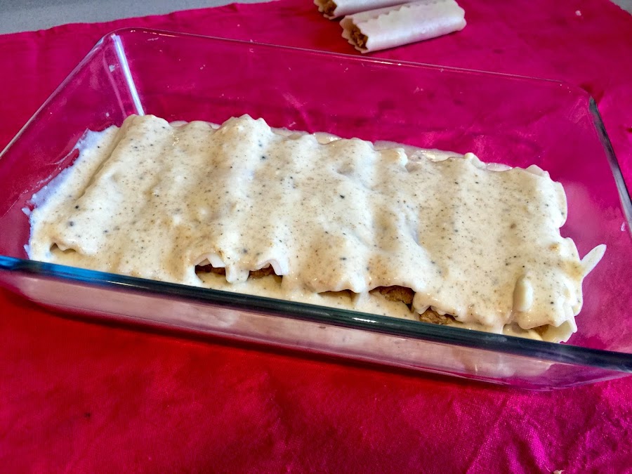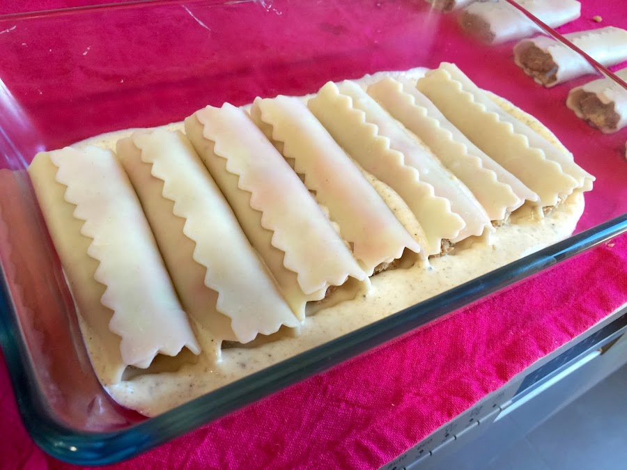 23. Ponemos en la bandeja de horno una capa finita de bechamel, y encima los 8 canelones. Es importante que el cierre del canelón quede hacia arriba, si lo colocásemos hacia abajo en el momento de servir los romperíamos Hemos preparado 5 bandejas de 8 canelones. Hemos congelado cuatro y una la hemos reservado para comer ese mismo día. Si las queréis congelar, dejarlas cubiertas con la bechamel, pero sin el queso. El queso, la mantequilla y la trufa rallada ponerlo el día que los vayáis a hornear.